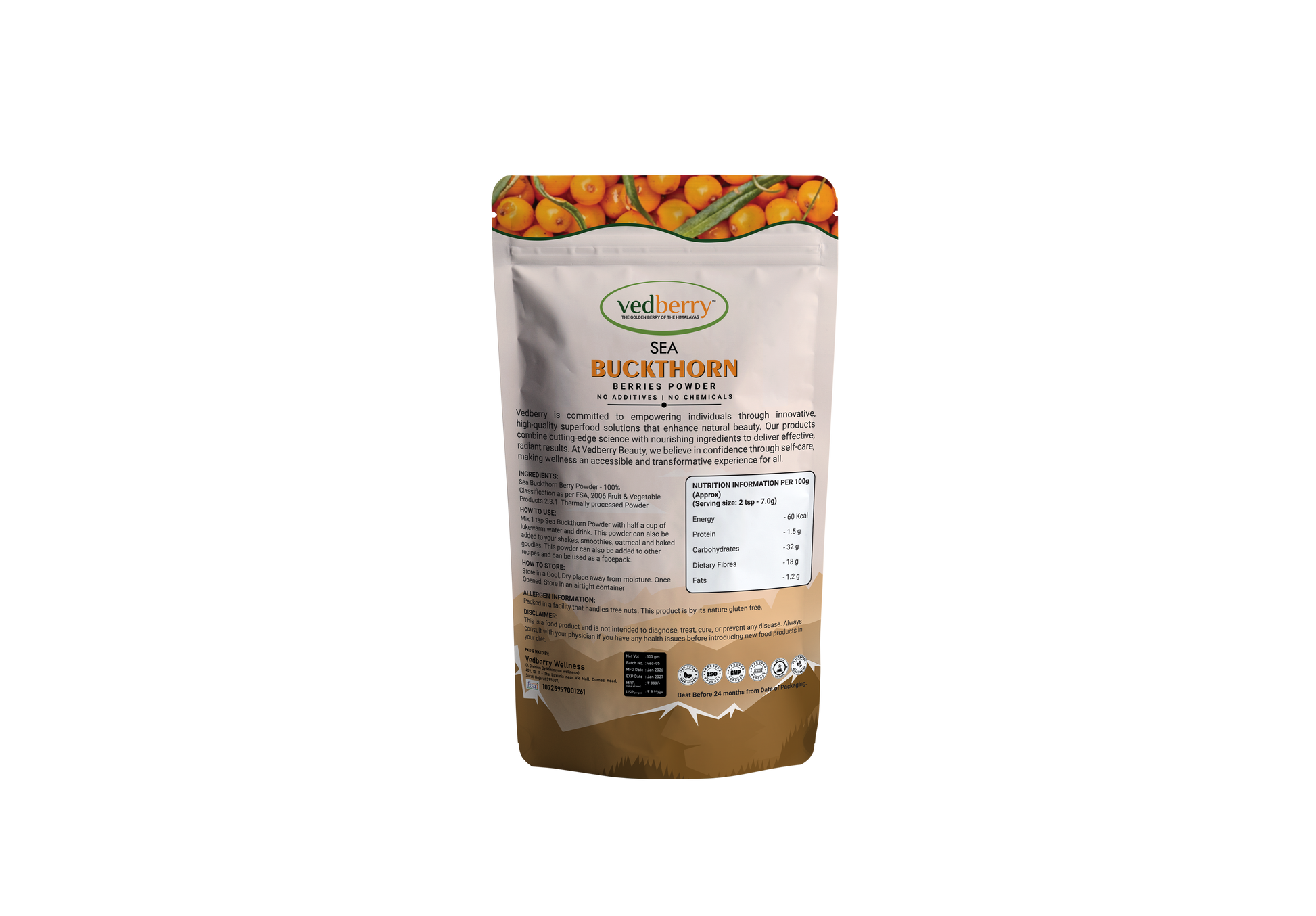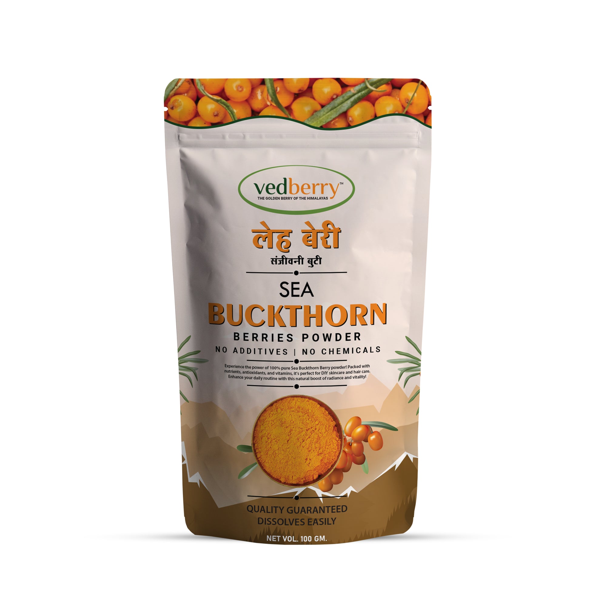 - 100% pure organic sea buckthorn berry powder with no additives or preservatives.